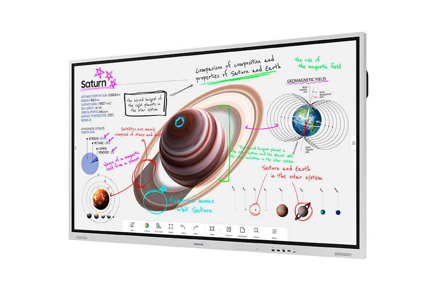 Дисплей сочетает высокую производительность с интуитивным управлением. Основные рабочие характеристики включают функцию одновременной работы до 20 касаний, позволяющую нескольким пользователям взаимодействовать с контентом. Встроенная интерактивная панель Samsung Tizen обеспечивает доступ к приложениям для видеоконференций, браузеру и инструментам аннотирования. Поддержка беспроводной трансляции экрана по стандартам Miracast и AirPlay 2 упрощает подключение мобильных устройств и ноутбуков. Сильная сторона — интеграция с системами видеоконференцсвязи, включая совместимость с популярными облачными сервисами, что превращает дисплей в полноценный узел для дистанционных совещаний.